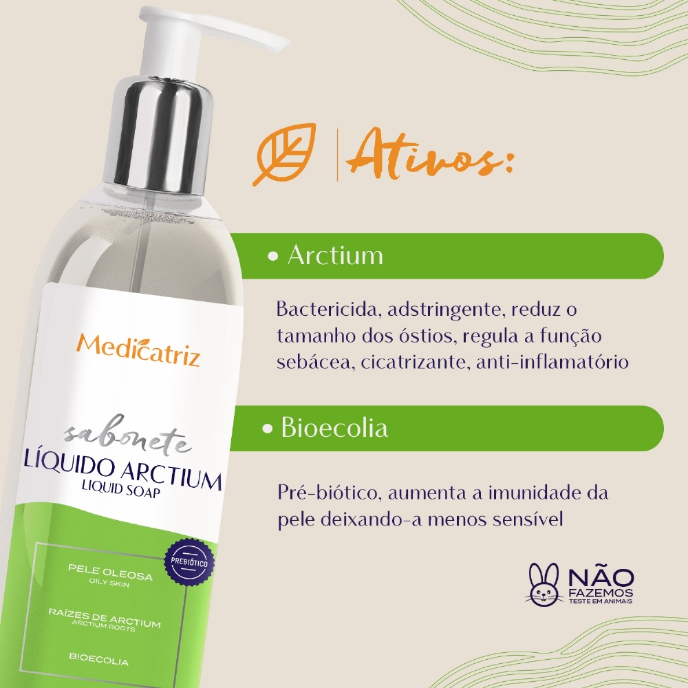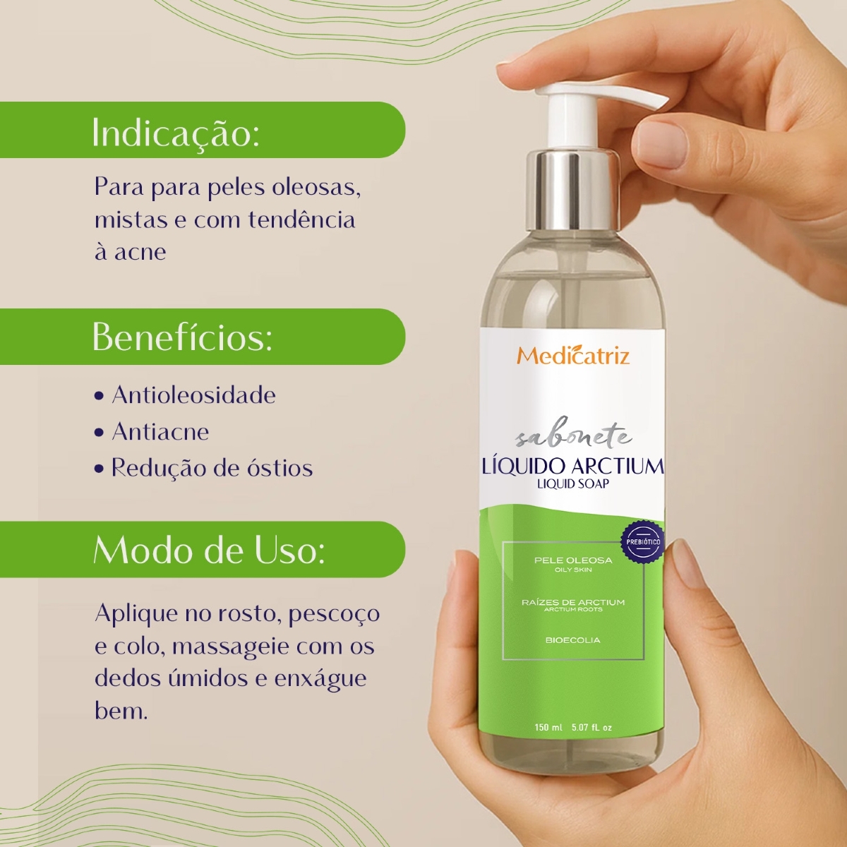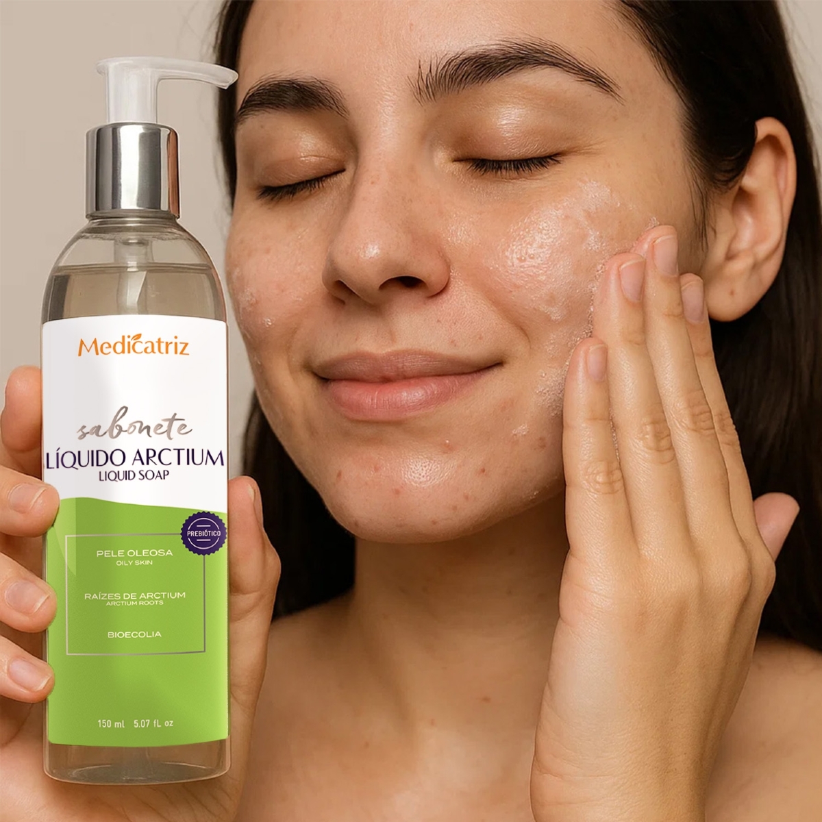 O Sabonete Líquido Arctium é a escolha perfeita para quem tem pele oleosa, mista ou com tendência à acne e busca uma limpeza profunda, eficaz e gentil. Sua fórmula leve combina o poder do Arctium, que regula a oleosidade, acalma inflamações e ajuda na cicatrização, com o Bioecolia, um prebiótico que fortalece a defesa natural da pele e aumenta sua resistência. Ele remove o brilho excessivo sem ressecar, reduz a aparência dos poros e ajuda a prevenir o retorno das lesões acneicas. A pele fica imediatamente mais limpa, fresca, equilibrada e com um toque suave e aveludado. Ideal para o cuidado diário de peles femininas e masculinas.